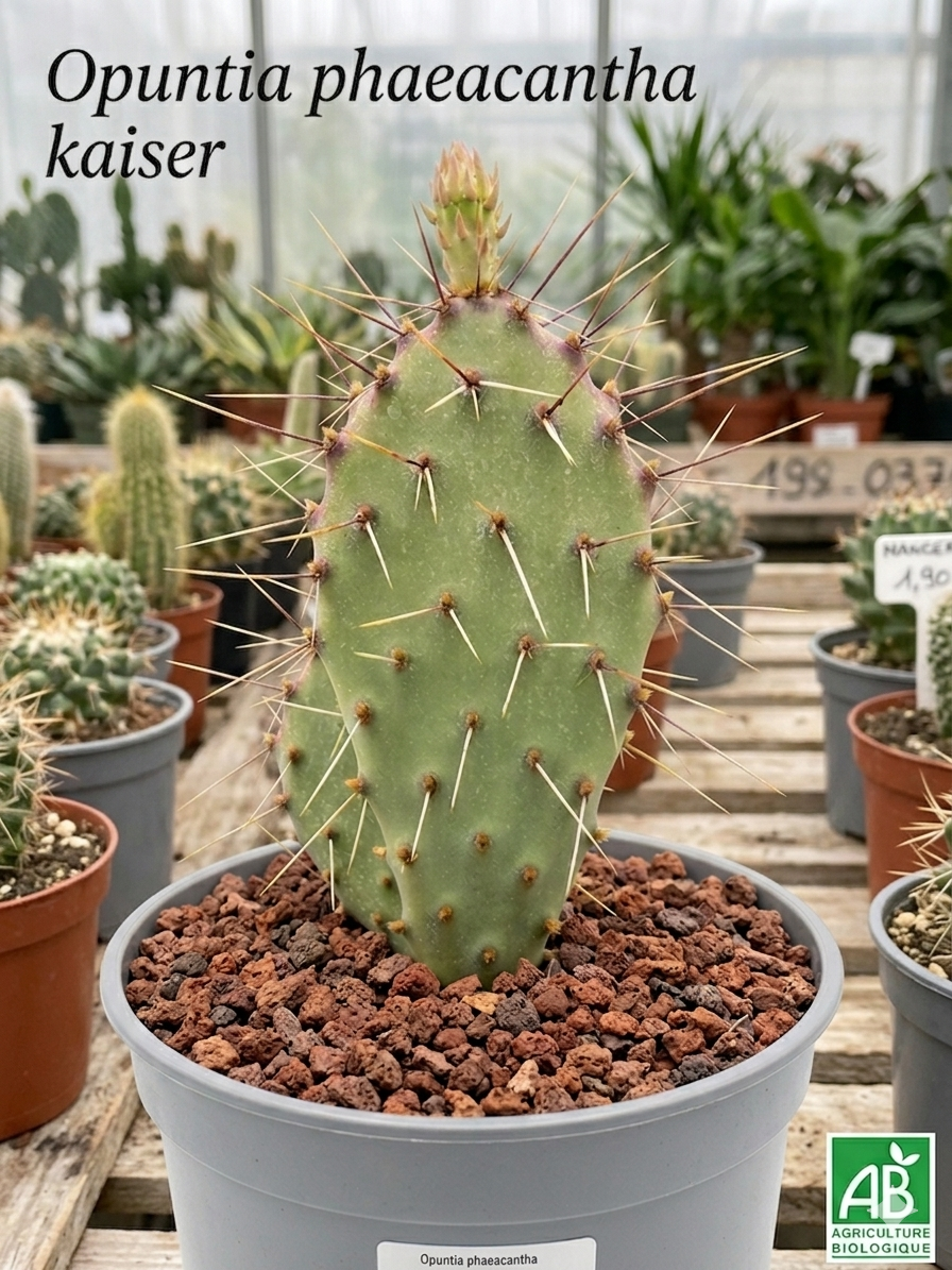 Chaque Opuntia phaeacantha ‘Kaiser’ est cultivé en pépinière dans un substrat drainant adapté, pour favoriser un enracinement sain dès le départ. Tu le recevras en pot, prêt à s’acclimater chez toi ou en pleine terre selon ton climat.